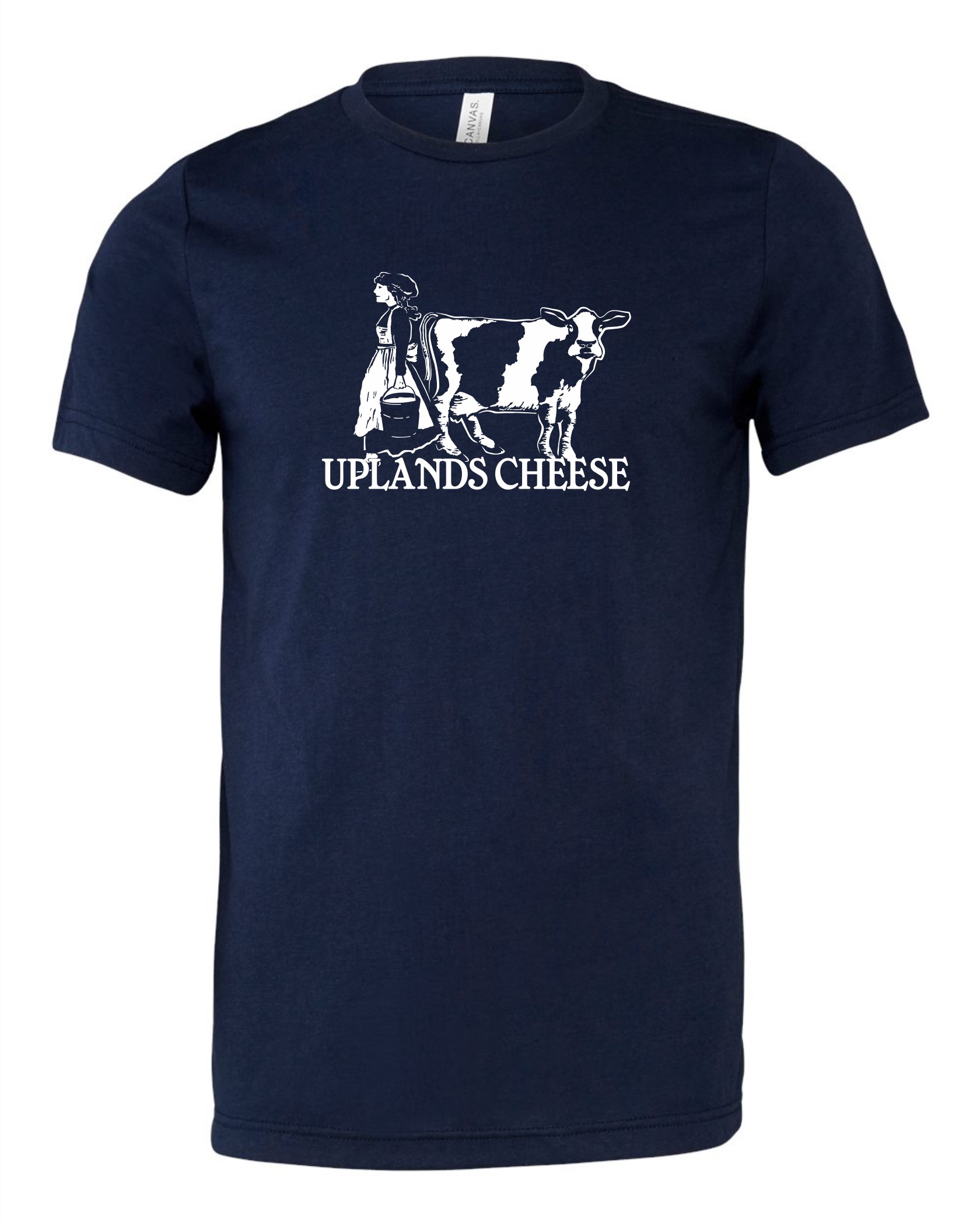 Navy blue t-shirt with the Uplands Cheese logo on the front.  Unisex sizing S-XL.